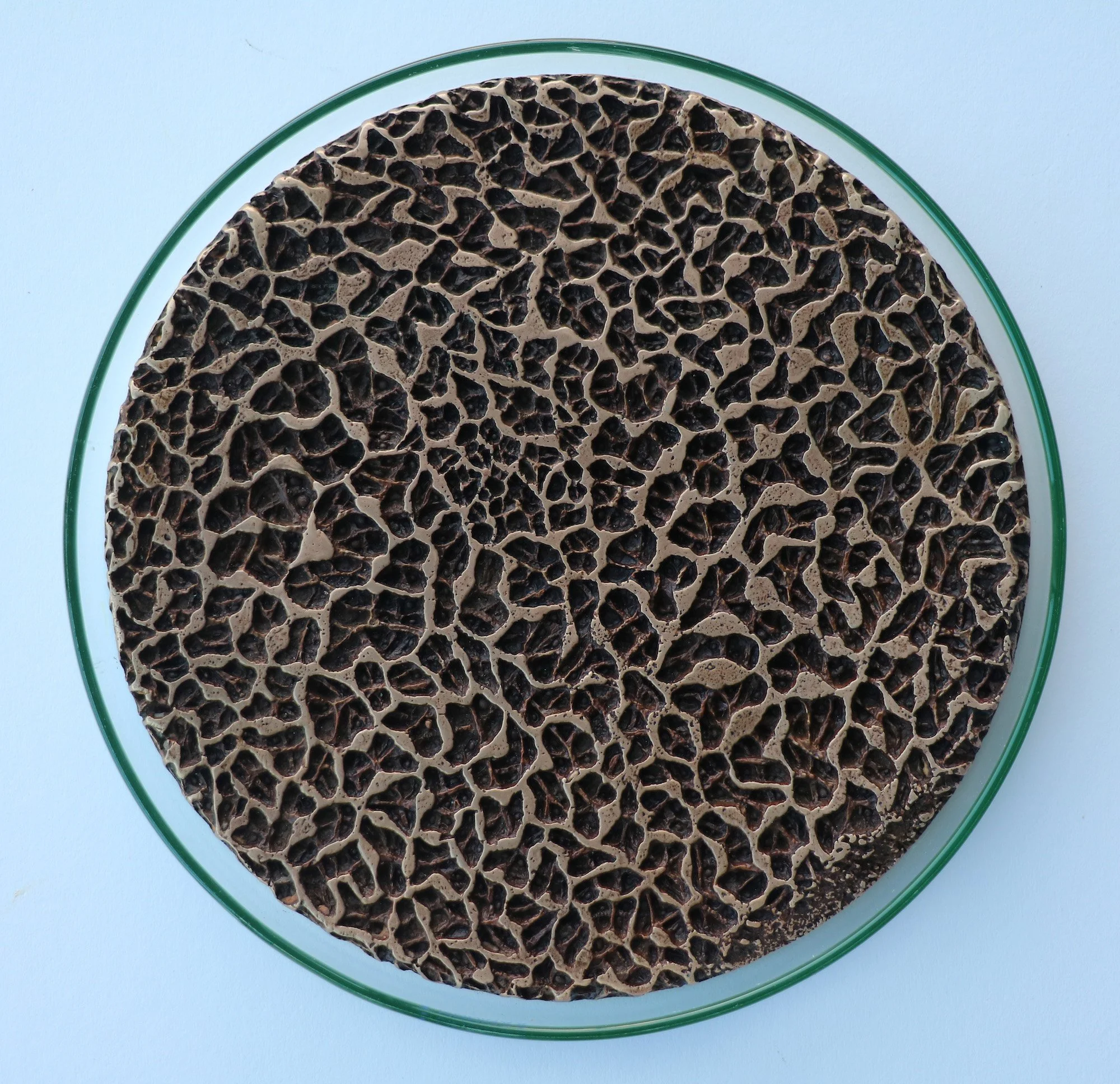 Michael Geddis, Pandora's Box I - Neurogenesis, 2025, bronze, on glass, 20 cm diameter.